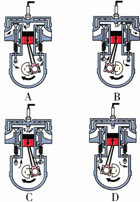 C 【解析】在汽油机的四个冲程中只有做功冲程对外做功,其他三个冲程都是靠飞轮的惯性完成的。题图A中进气门打开,活塞向下运动,汽缸容积增大,是吸气冲程,故A不符合题意;题图B中排气门打开,活塞向上运动,汽缸容积减小,是排气冲程,故B不符合题意;题图C中两气门都关闭,活塞向下运动,火花塞点火,汽缸容积增大,是做功冲程,故C符合题意;题图D中两气门都关闭,活塞向上运行,汽缸容积减小,是压缩冲程,故D不符合题意。