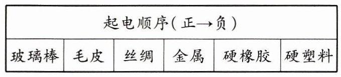 9.D 【解析】由题知,表格中任意两种物质相互摩擦时,次序在前的带正电,次序在后的带负电,与丝绸摩擦过的硬橡胶带负电,故A错误;跟硬塑料摩擦过的毛皮带正电,硬塑料带负电,故B错误;摩擦起电过程是得失电子的过程,正电荷数不变,故C错误;与玻璃棒摩擦过的丝绸带负电,得到电子,玻璃棒失去电子,故D正确。