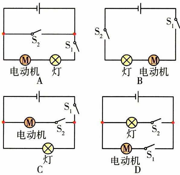 7. (知识点3·能力点1)如图是新一代代步工具电动独轮车,依靠电力驱动低碳环保。当电源开关$S_1$闭合时指示灯亮起,独轮车处于待机状态,再当人站在独轮车上时开关$S_2$自动闭合,电动机才能启动,开始运动。下列图所示电路设计符合上述要求的是(