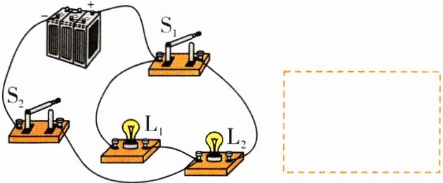 [解析]由实物图可知,两灯并联,开关S₂在干路上控制整个电路,开关S₁在L₂支路上,由此画出电路图如图所示。