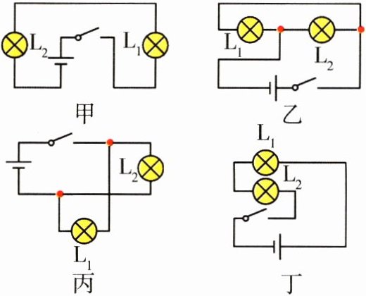 5.B [解析]甲、丁中,两个灯泡首尾顺次连接,电路只有一条电流路径,故两灯泡是串联的;乙、丙中,两个灯泡“头头”相连、“尾尾”相连,电路有两条电流路径,因此灯泡是并联连接。