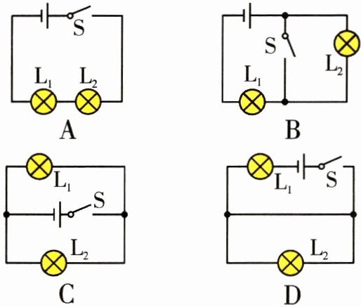 1.C [解析]由A图可知,开关S闭合后,电路中只有一条电流路径,则两灯是串联的,A不符合题意;由B、D图可知,开关闭合后,灯L₂被短接,只有灯L₁发光,B、D不符合题意;由C图可知,开关S闭合后,两灯并列连接,即两灯是并联的,C符合题意。