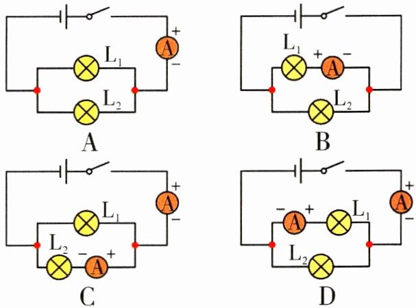 D [解析]A图中电流表测干路电流,A不符合题意;B图中电流表与灯L₁串联,但电流表正负接线柱接反了,B不符合题意;C图中一个电流表测量干路电流,另一个电流表测量灯L₂所在支路电流,不能直接测量通过灯L₁的电流,C不符合题意;D图中有一个电流表与灯L₁串联,电流表的正负接线柱正确,电流表能直接测量通过灯L₁的电流,D符合题意。