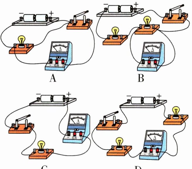 D [解析]A图中电流表与灯泡并联,会造成短路,A错误;B图中电流表与其中一盏灯泡并联,会将这盏灯泡短接,B错误;C图中电流表的正负接线柱接反了,会使电流表指针反偏,C错误;D图中电流表串联在电路中,正负接线柱连接正确,D正确。