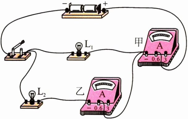 解 由图可知,灯 $ L_1 $ 与 $ L_2 $ 并联,甲电流表测干路电流,乙电流表测通过灯 $ L_2 $ 的电流,根据并联电路电流的特点可知,通过灯 $ L_1 $ 的电流为 $ 0.5 A - 0.2 A = 0.3 A $。
