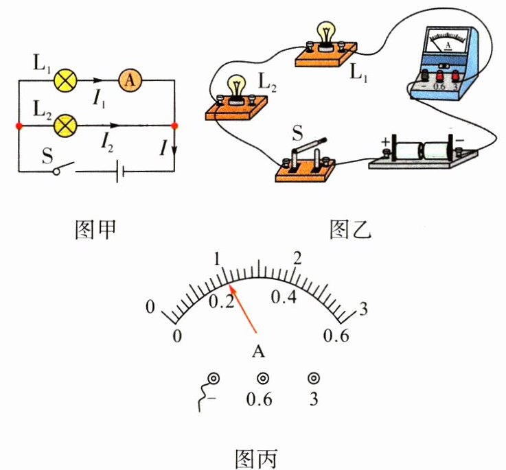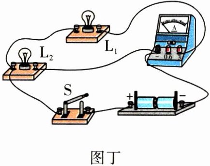 (2) 该电路为并联电路,电流表测量灯泡 $ L_1 $ 的电流,开关控制整个电路,实物图如图丁所示。