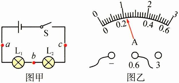 。(2) 她先把电流表接在 $ a $ 处,闭合开关后,电流表的指针指示位置如图乙所示,则所测的电流值为