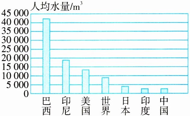(1)根据图示可以看出我国的人均水量不到$ 5000m^3,$远小于世界人均水量,故我国是一个水资源短缺的国家。