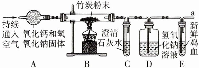,E 装置中新鲜的鸡血变为暗红色。(2) 小玥认为应在 A、B 装置间再增加一个 C 装置,目的是