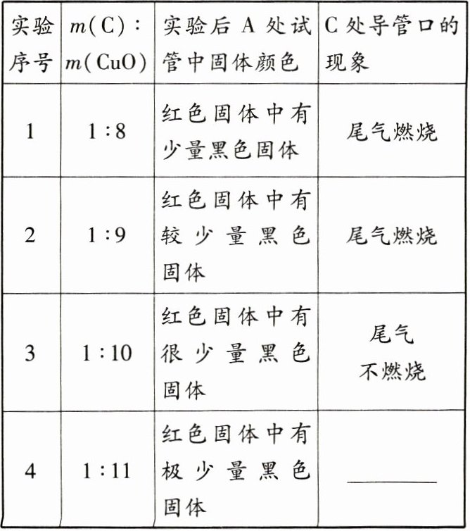 。(2) 上述探究可得出,实验时所用木炭粉和氧化铜的质量比为 1 : 10 ~ 1 : 12 时,可观察到黑色固体明显变红,同时还可减少