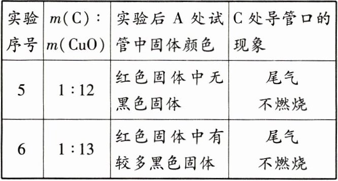 (填化学式)的排放,防止空气污染。【反思评价】分析发现,实验 5 中 $m(C) : m(CuO)$ 的值与理论值不符,实验后却无黑色固体残留。请用化学方程式解释实验中过量的黑色固体消失的原因: