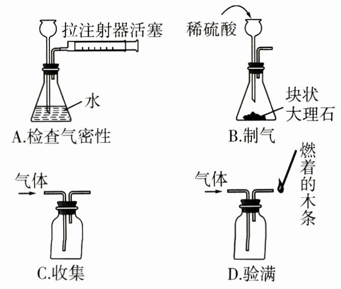 3. B [解析]检查图中装置气密性时,拉注射器活塞,若装置的气密性良好,则在长颈漏斗的下端会有气泡冒出,故A正确。制取二氧化碳时不能用稀硫酸,因为稀硫酸与碳酸钙发生反应,会生成微溶于水的硫酸钙,它覆盖在大理石的表面阻碍反应的进一步进行,使反应进行一段时间就停止了,故B 错误。二氧化碳的密度比空气大,用图中装置收集时应将进气管伸到集气瓶的底部,故C正确。验满时应将燃着的木条放在集气瓶口,若用图D中装置,燃着的木条应放在出气管一边,故D正确。