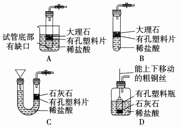 4. B [解析]试管底部有缺口,只要放入烧杯中,稀盐酸可以进入试管产生气体,移出试管,稀盐酸与大理石分离开,反应停止,可以控制反应的进行,故A不符合题意;虽然有带孔的塑料片,但是稀盐酸一直浸没大理石,无法控制反应的进行,故B符合题意;石灰石在有孔塑料片上,打开开关,U形管右边液面上升,稀盐酸就会浸没石灰石产生气体,关闭开关,U形管右边压强增大,盐酸又被压到塑料片以下,可以控制反应的进行,故C不符合题意;可以上下移动铜丝,从而控制反应的进行,故D不符合题意。