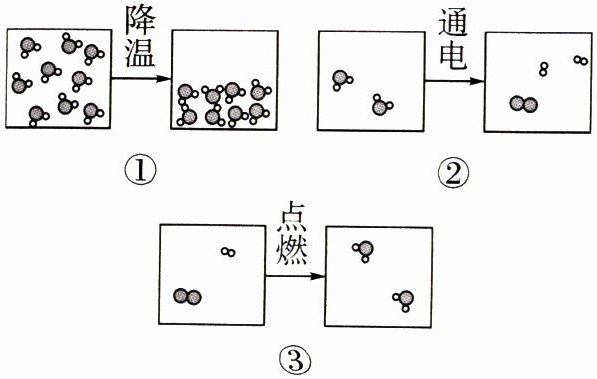5. 如图分别是水蒸气液化,水通电分解生成氢气、氧气,氢气在氧气中燃烧生成水的微观变化示意图。