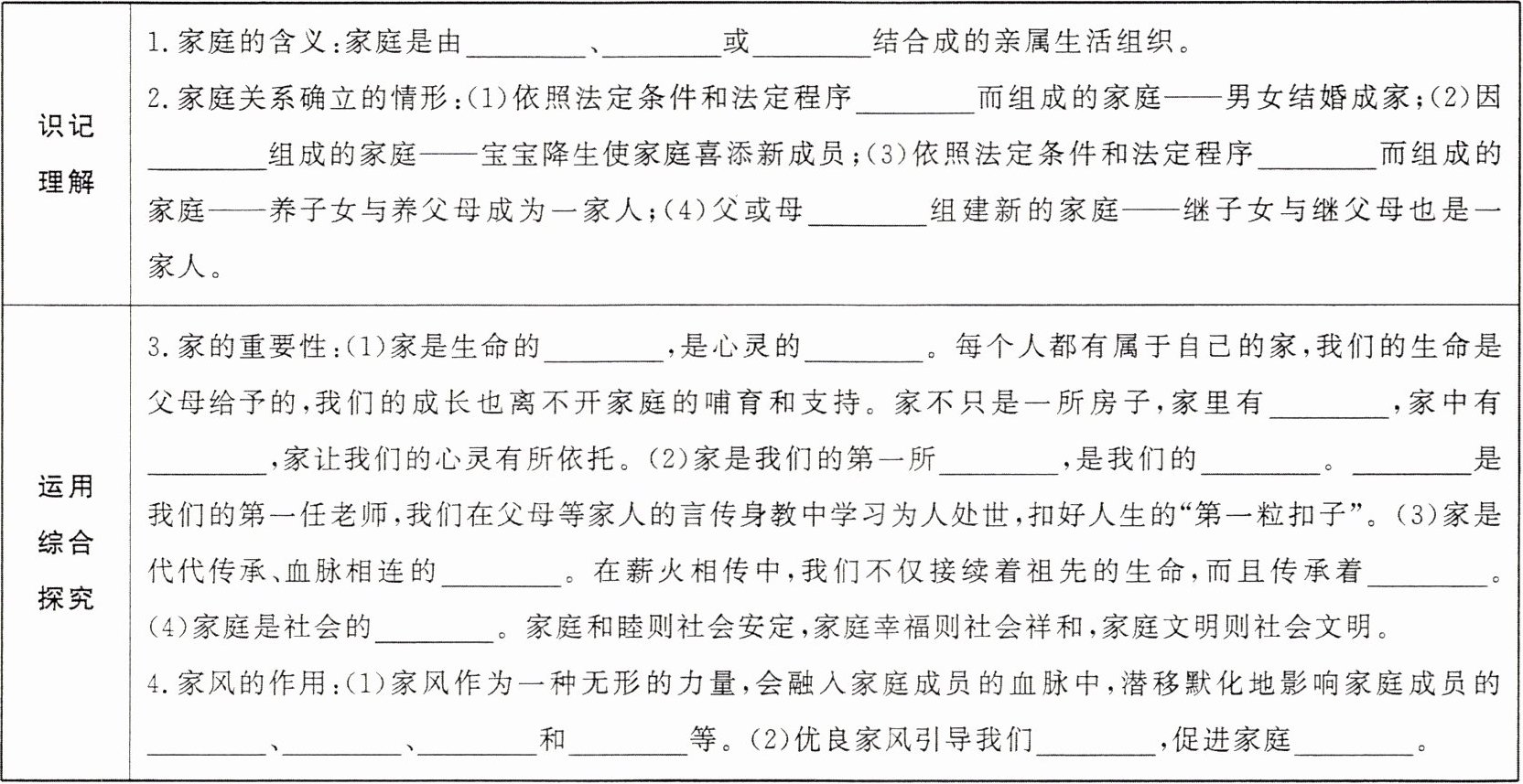 | 运用综合探究 | 3. 家的重要性:(1)家是生命的______,是心灵的______。每个人都有属于自己的家,我们的生命是父母给予的,我们的成长也离不开家庭的哺育和支持。家不只是一所房子,家里有______,家中有______,家让我们的心灵有所依托。(2)家是我们的第一所______,是我们的______。______是我们的第一任老师,我们在父母等家人的言传身教中学习为人处世,扣好人生的“第一粒扣子”。(3)家是代代传承、血脉相连的______。在薪火相传中,我们不仅接续着祖先的生命,而且传承着______。(4)家庭是社会的______。家庭和睦则社会安定,家庭幸福则社会祥和,家庭文明则社会文明。