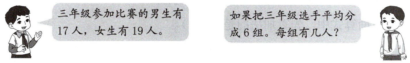 三年级参加比赛的男生有$17$人,女生有$19$人。如果把三年级选手平均分成$6$组。每组有几人?