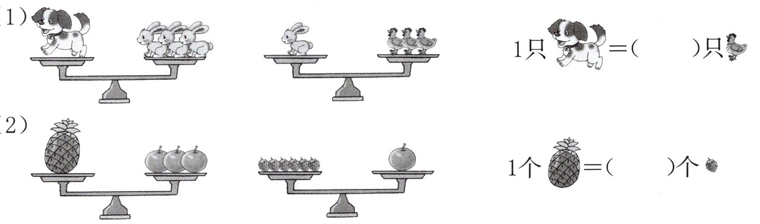 2. 小熊想用3个南瓜和小兔换青菜。小兔说:“2个南瓜可以换4根萝卜,1根萝卜可以换3棵青菜。”小熊用它的3个南瓜可以换到小兔的几棵青菜?