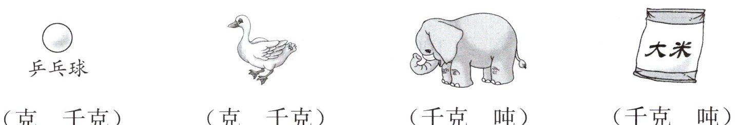 1. 计量下面的物品有多重,用哪个单位合适?圈一圈。