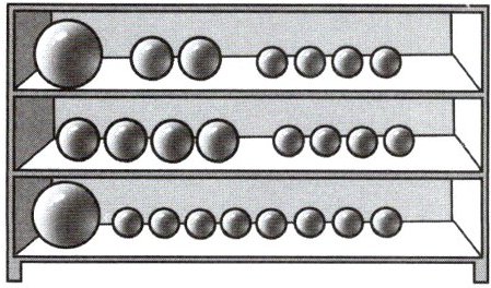 体育用品柜里放有大、中、小三种球,1个小球重150克,每层的质量相等。大、中球每个各重多少克?
