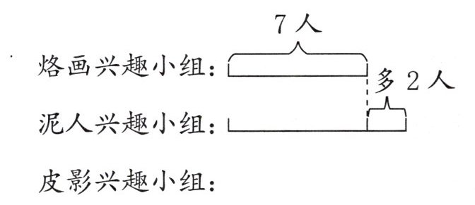 (4)①线段图:烙画兴趣小组:7人;泥人兴趣小组:7 + 2线段(长度为烙画线段加长一点表示多2人);皮影兴趣小组:3条泥人线段长度(表示是泥人小组的3倍)。