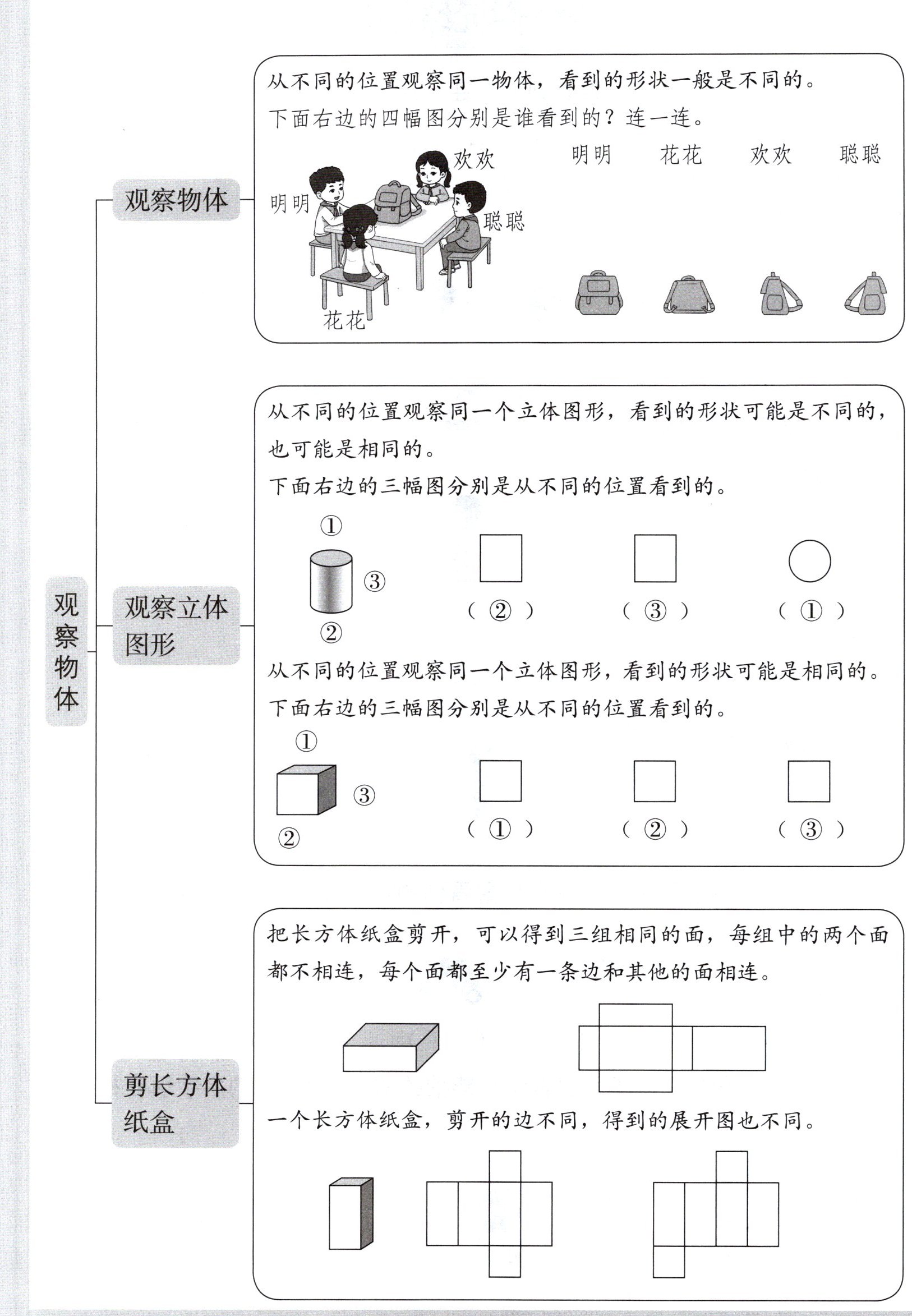 观察物体连线(略,需按实际图形方向对应);观察立体图形填空(②)(③)(①)、(①)(②)(③);剪长方体纸盒描述正确。