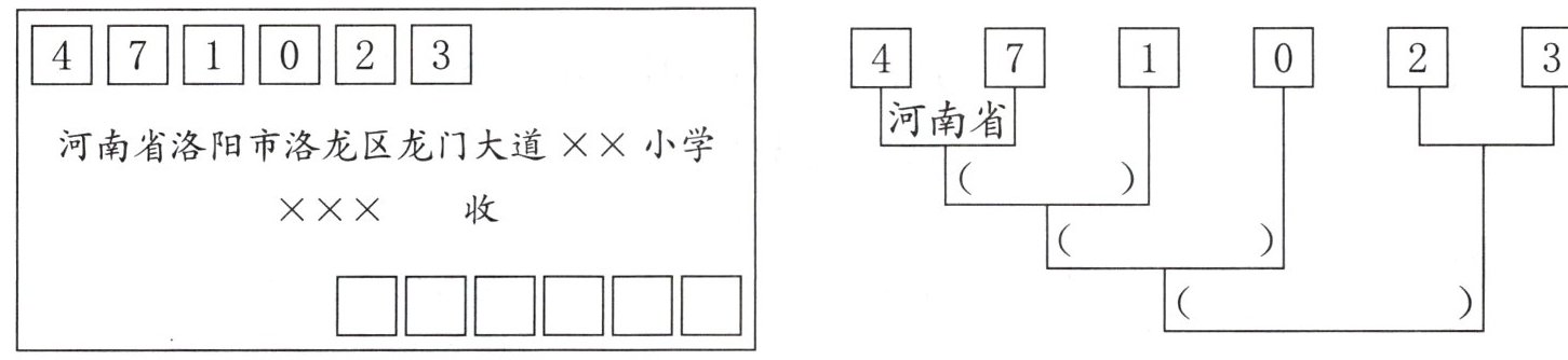 )位数字组成的,用来定位邮寄地址。请根据下面信封上的信息照样子填一填。