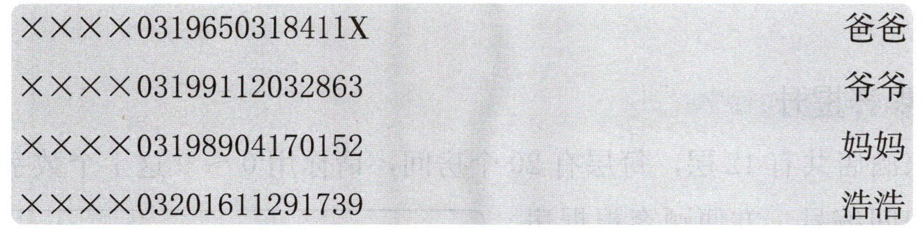 ××××0319650318411X-爷爷;××××03199112032863-妈妈;××××03198904170152-爸爸;××××03201611291739-浩浩