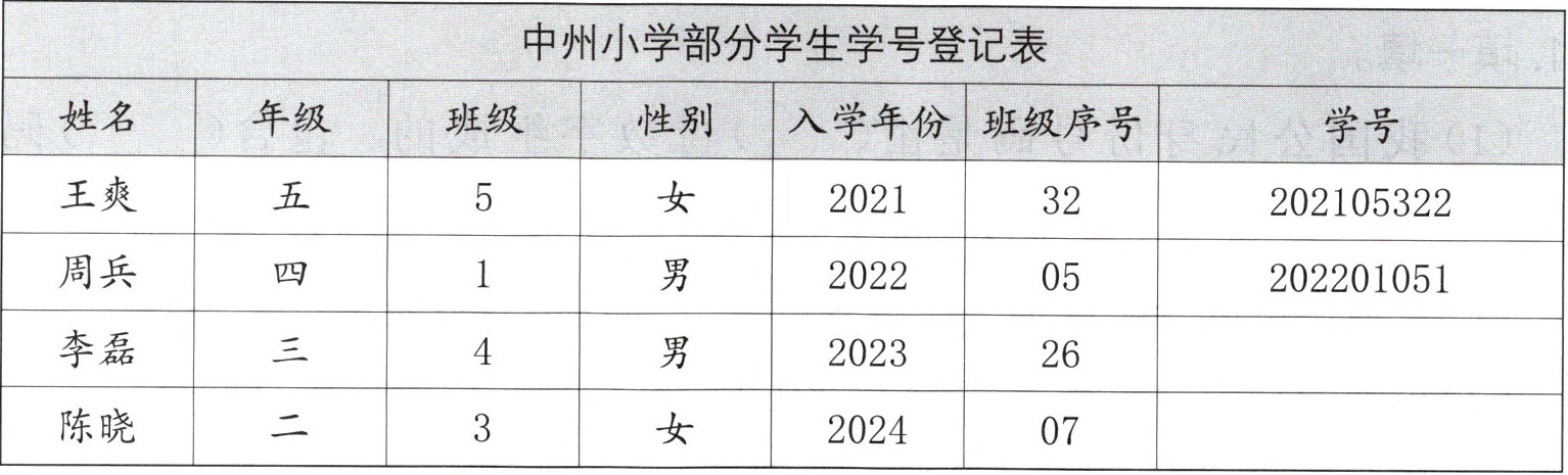 (2)中州小学学生学号的编排规律是:从左边起,前四位表示(