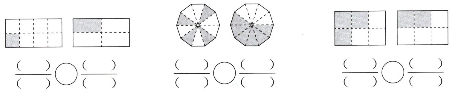 2. 把下面各图中的涂色部分用分数表示出来,再比较每组分数的大小。