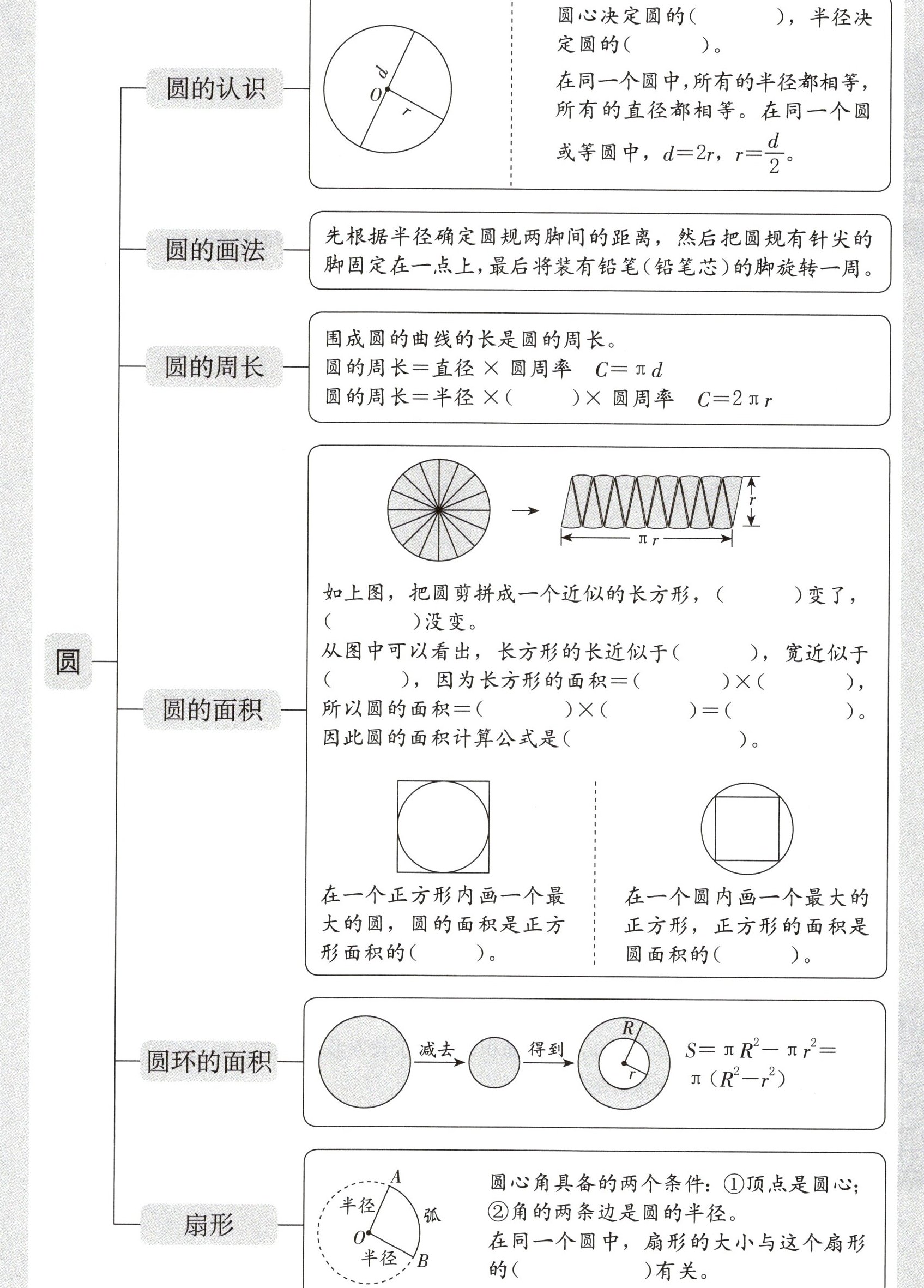 从图中可以看出,长方形的长近似于( ),宽近似于( ),因为长方形的面积 = ( )×( ),所以圆的面积 = ( )×( )= ( )。因此圆的面积计算公式是( )。
