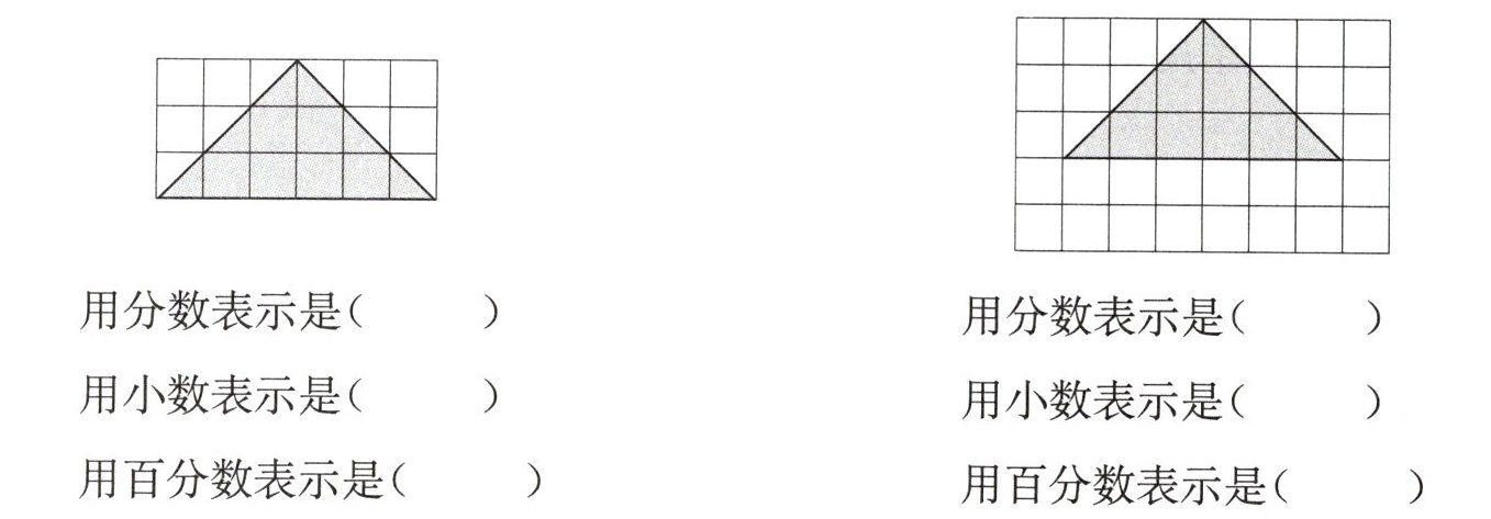 第一个图形 用分数表示是$\frac{1}{2}$ 用小数表示是$0.5$ 用百分数表示是$50\%$ 第二个图形 用分数表示是$\frac{9}{40}$ 用小数表示是$0.225$ 用百分数表示是$22.5\%$