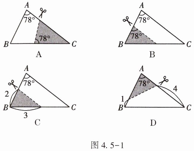 4. (★)如图 4.5 - 1,在△ABC 中,∠A = 78°,AB = 4,AC = 6,将△ABC 沿图示中的虚线剪开,剪下的阴影三角形与原三角形不相似的是【 】