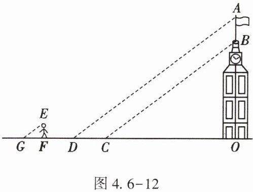 14. (★★)(2022·陕西)小明和小华利用阳光下的影子来测量一建筑物顶部旗杆的高.如图4.6-12,在某一时刻的阳光下,他们分别测得该建筑物OB的影长OC为16米,OA的影长OD为20米,小明的影长FG为2.4米,其中O,C,D,F,G五点在同一直线上,A,B,O三点在同一直线上,且AO⊥OD,EF⊥FG.已知小明的身高EF为1.8米,求旗杆的高AB.