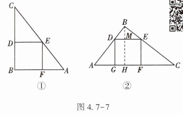 14. (★★)一块直角三角形木板的一条直角边$AB$为$1.5m$,面积为$1.5m^{2}$,要把它加工成一个面积最大的正方形桌面. 小明打算按图 4.7 - 7①进行加工,小华准备按图 4.7 - 7②进行加工,他们谁的加工方案符合要求?