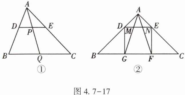 (2)如图4.7-17②,在△ABC中,∠BAC=90°,正方形DEFG的四个顶点在△ABC的边上,连接AG,AF分别交DE于M,N两点。