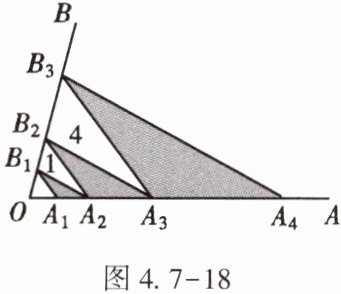 16. (★★)如图4.7-18,点$A_{1}$,$A_{2}$,$A_{3}$,$A_{4}$在射线OA上,点$B_{1}$,$B_{2}$,$B_{3}$在射线OB上,且$A_{1}B_{1}//A_{2}B_{2}//A_{3}B_{3}$,$A_{2}B_{1}//A_{3}B_{2}//A_{4}B_{3}$。若△$A_{2}B_{1}B_{2}$和△$A_{3}B_{2}B_{3}$的面积分别为1和4,则图中三个阴影三角形的面积之和为____。