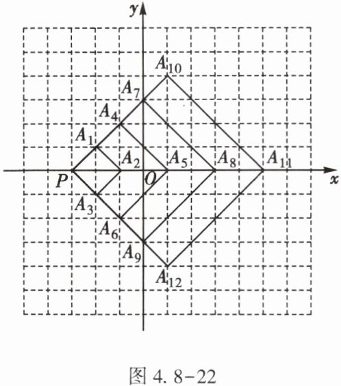 14. (★★★)(2023·烟台)如图 4.8 - 22,在平面直角坐标系中,每个网格小正方形的边长均为 1 个单位长度,以点 P 为位似中心作正方形 PA₁A₂A₃,正方形 PA₄A₅A₆,……,按此规律作下去,所作正方形的顶点均在格点上,其中正方形 PA₁A₂A₃ 的顶点坐标分别为 P(-3,0),A₁(-2,1),A₂(-1,0),A₃(-2,-1),则顶点 A₁₀₀ 的坐标为【 】