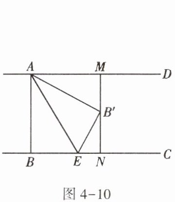 16. (★★★)如图 4 - 10,已知 $ AD // BC $,$ AB \perp BC $,$ AB = 3 $。$ E $ 为射线 $ BC $ 上一个动点,连接 $ AE $,将 $ \triangle ABE $ 沿 $ AE $ 折叠,点 $ B $ 落在点 $ B' $ 处,过点 $ B' $ 作 $ AD $ 的垂线,分别交 $ AD $,$ BC $ 于点 $ M $,$ N $。当点 $ B' $ 为线段 $ MN $ 的三等分点时,$ BE $ 的长为