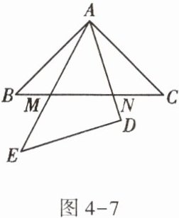 13. (★★)已知 $ \triangle ABC $ 和 $ \triangle ADE $ 都是等腰直角三角形,$ \angle BAC = \angle ADE = 90^{\circ} $,如图 4 - 7 所示放置,边 $ AE $,$ AD $ 分别与 $ BC $ 交于点 $ M $,$ N $,则图中一定相似的三角形有【 】