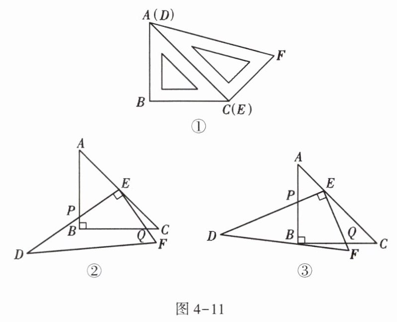 17. (★★★)如图 4 - 11①,一副直角三角板满足 $ AB = BC $,$ AC = DE $,$ \angle ABC = \angle DEF = 90^{\circ} $,$ \angle EDF = 30^{\circ} $。将三角板 $ DEF $ 的直角顶点放置于三角板 $ ABC $ 的斜边 $ AC $ 上,再将三角板 $ DEF $ 绕点 $ E $ 旋转,并使边 $ DE $ 与边 $ AB $ 交于点 $ P $,边 $ EF $ 与边 $ BC $ 交于点 $ Q $。