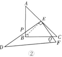 (1) $EP = EQ$【提示】如图②,连接$BE$,根据$E$是$AC$的中点和等腰直角三角形的性质,得$BE = CE$,$\angle PBE = \angle C = 45^{\circ}$。