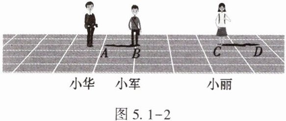 6. (★★)如图5.1 - 2,小华、小军、小丽同时站在路灯下,其中小军和小丽的影子分别是AB,CD.