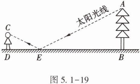 14. (★★)为了测量校园内一棵不可攀的树的高度,学校数学应用实践小组做了如下的探索:根据光的反射定律,利用一面镜子和皮尺,设计了如图5.1 - 19所示的测量方案:把镜子放在离树(AB)8.7m的点E处,然后观测者沿着直线BE后退到点D,这时恰好在镜子里看到树梢顶点A,再用皮尺量得DE = 2.7m,观测者目高CD = 1.6m,则树高AB约是