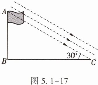 11. (★)某课外活动小组测量学校旗杆的高度。如图5.1 - 17,当太阳光线与地面成30°角时,测得旗杆AB在地面上的投影BC长为24米,则旗杆AB的高度约是