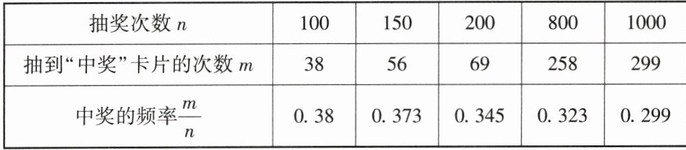 3. 某商场进行抽奖活动,每名顾客购物满 100 元可以获得一次抽奖机会. 抽奖箱中只有两种卡片:“中奖”和“谢谢惠顾”(两种卡片形状大小相同、质地均匀). 下表是活动进行中的一组统计数据: