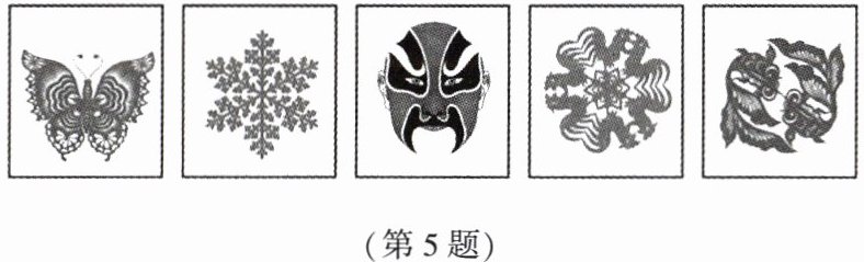 5. (2023·东营)剪纸是中国最古老的民间艺术之一,先后入选中国国家级非物质文化遗产名录和人类非物质文化遗产代表作名录. 小文购买了以“剪纸图案”为主题的 5 张书签,他想送给好朋友小乐一张. 小文将书签背面朝上(背面完全相同),让小乐从中随机抽取一张,则小乐抽到的书签图案既是轴对称图形又是中心对称图形的概率是(