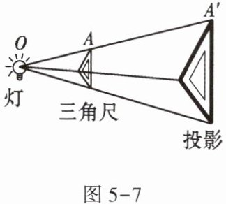 7. (★)三角尺在灯泡 $ O $ 的照射下在墙上形成的影子如图 5-7 所示。现测得 $ OA = 20cm $,$ OA' = 50cm $,这个三角尺的周长与它在墙上形成的影子的周长的比是
