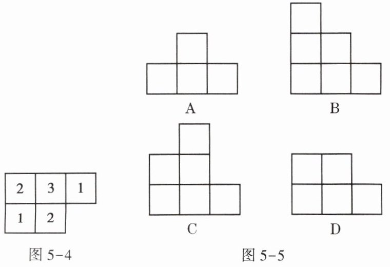 4. (★★)图 5-4 是由若干个相同的小正方体组成的几何体的俯视图,小正方形中的数字表示该位置小正方体的个数,则这个几何体的主视图是图 5-5 中的【 】