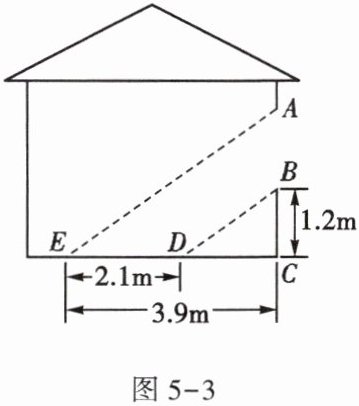 3. (★★)阳光通过窗口照到教室内,竖直窗框在地面上留下 $ 2.1m $ 长的影子(如图 5-3 所示),已知窗框的影子 $ DE $ 的前端到窗下墙脚的距离 $ CE = 3.9m $,窗口底边离地面的距离 $ BC = 1.2m $,试求窗口的高度 $ AB $ 的值。
