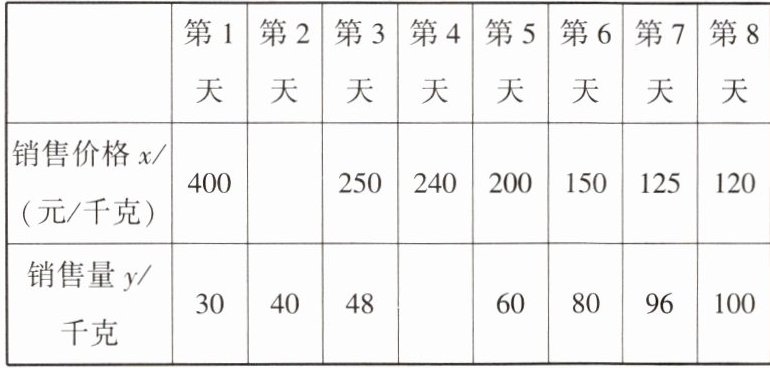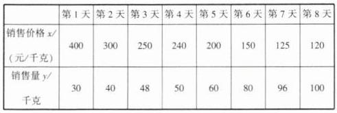 观察表中数据,发现可以用反比例函数刻画这种海产品每天的销售量$y$(千克)与销售价格$x$(元/千克)之间的关系.现假定在这批海产品的销售过程中,每天的销售量$y$(千克)与销售价格$x$(元/千克)之间都满足这一关系.